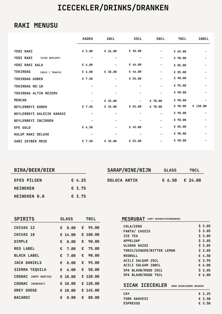 Cola/ZeroFanta/CassisIce TeaApplesapUludag GazozTonic/Ginger/Bitter LemonRedbullAcili Salgam 25clAcili Salgam 100clSpa Blauw/Rood 25clSpa Blauw/Rood 75cl